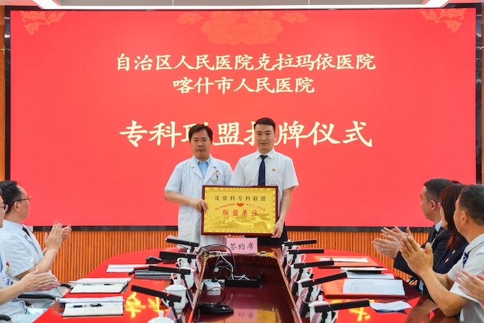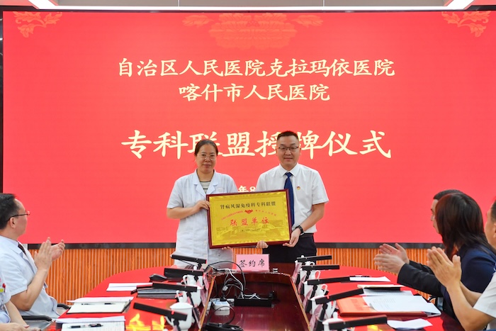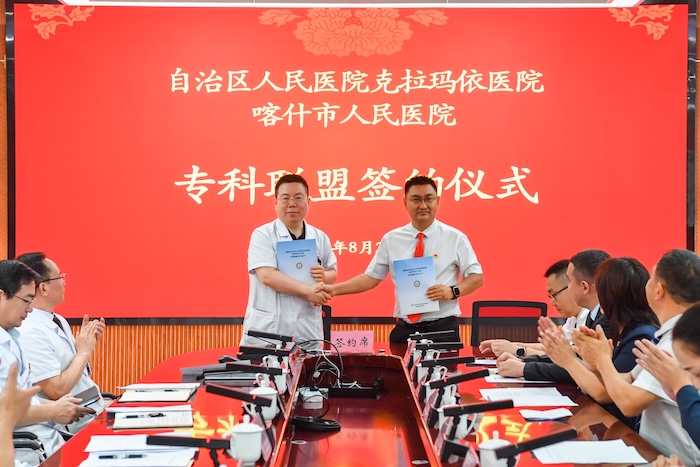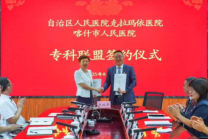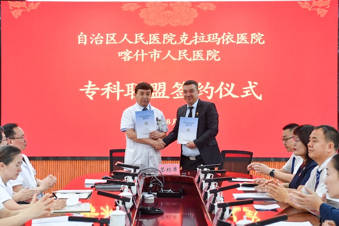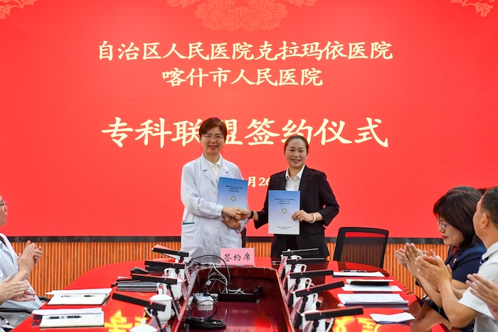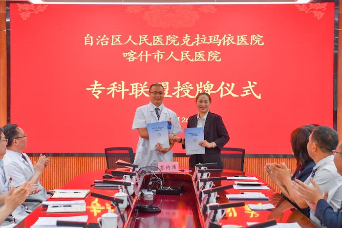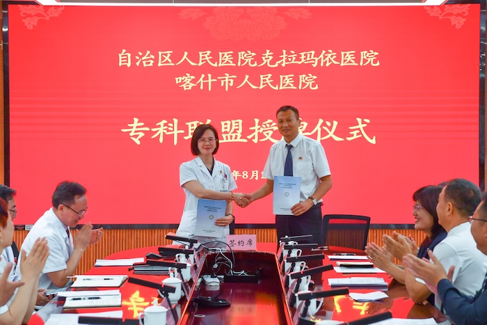 如今,喀什市人民医院五大中心已陆续挂牌运行,关键指标持续提升,区域医疗服务综合能力不断增强。去年,我们在落实对口帮扶协议基础上,签订3个专科联盟,推动帮扶更精准高效。今天,又新增五个专科联盟,拓展合作深度广度。