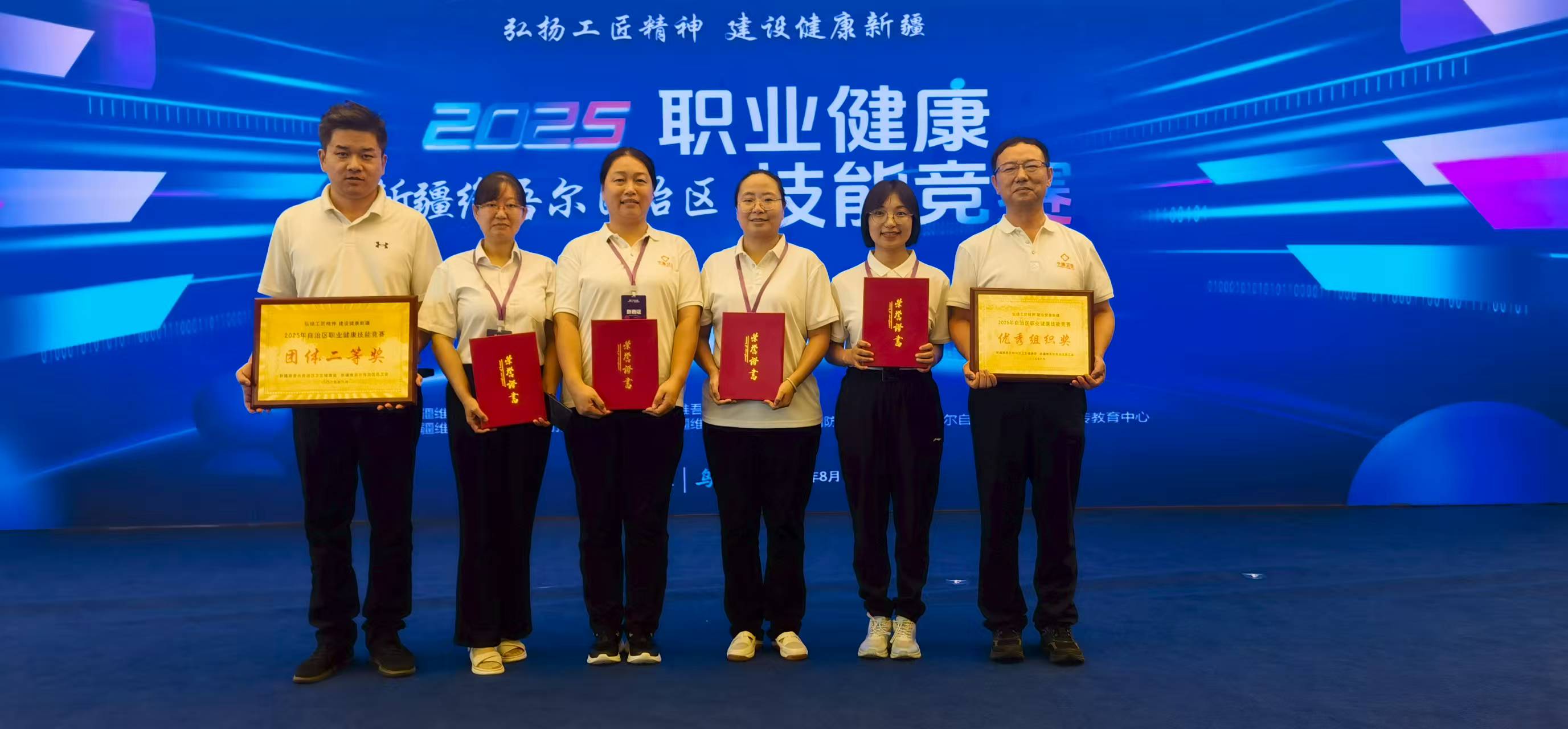 在高手云集的赛场中,闫玲医生宛如“破阵先锋”,以扎实的理论基础、丰富的临床经验和沉稳的临场应变,一路过关斩将突破重重关卡。最终,她不仅摘得自治区职业健康技能竞赛个人二等奖,更与团队协作拿下团体二等奖,用双份荣誉为健康管理中心赢得荣光,也将“勇拼搏、敢争先”的卫健精神展现得淋漓尽致。
