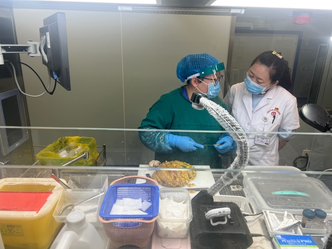 在三个多月的时间里,她扎根病理科各个工作环节,从标本接收、取材、制片,到切片阅片、诊断报告发放,全程参与、细致观察。