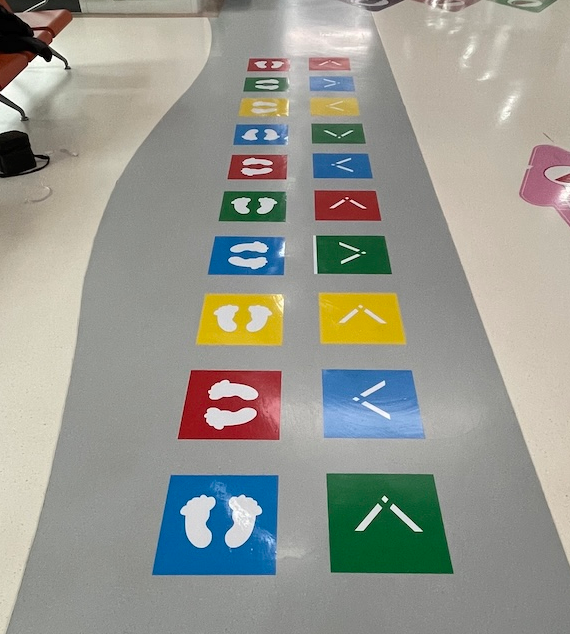 地面的儿童跳跃游戏贴,是为孩子量身打造的“情绪舒缓站”。考虑到患儿就诊时久坐等待的情况,贴合儿童活泼好动的天性,地面游戏以安全、趣味、益智为原则设计,既有锻炼肢体协调的跳跃闯关,也有认知数字、颜色的趣味互动。色彩斑斓的游戏贴设计暗藏专业考量:不同颜色的区域引导孩子进行各种动作——单脚跳、双脚跳、旋转跳。这些看似简单的游戏,实际能帮助孩子释放因紧张和等待积累的能量,有效降低焦虑水平。据观察,玩过游戏的孩子,进入诊室时明显更放松,与医生的配合度也更高。游戏成为孩子有效的“破冰器”,原本陌生的孩子们通过游戏互动,不时传来清脆的笑声,这在以往的医疗环境中是罕见的!